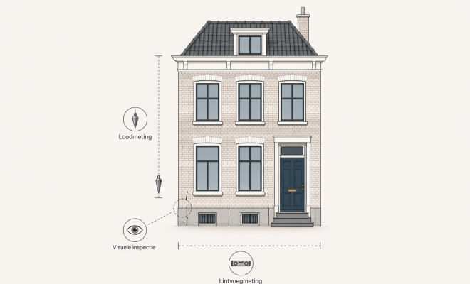 3. Lintvoegmeting: Meting van de horizontale uitlijning van de gevel om te kijken of er vervormingen zijn die op funderingsproblemen kunnen wijzen.